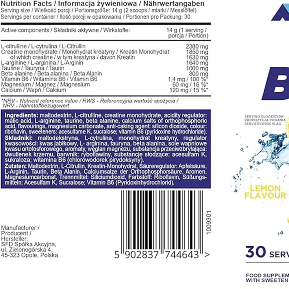 Étrend-kiegészítő. Édesítőszert tartalmaz. A termék 18 év feletti, fizikailag aktív személyeknek készült. Allergia esetén ne szedd! Ne lépd túl az ajánlott napi adagot! Az étrend-kiegészítő nem helyettesíti a változatos étrendet. Ajánlott a kiegyensúlyozott étrend és az egészséges életmód. A béta-alanin érzékeny személyeknél enyhe bizsergést okozhat. Gluténtartalmú gabonafélék, szója, tej származékokat tartalmazhat. A termék csomósodhat, de ez nem befolyásolja a tulajdonságait. Használat után mindig zárd vissza a csomagolást.