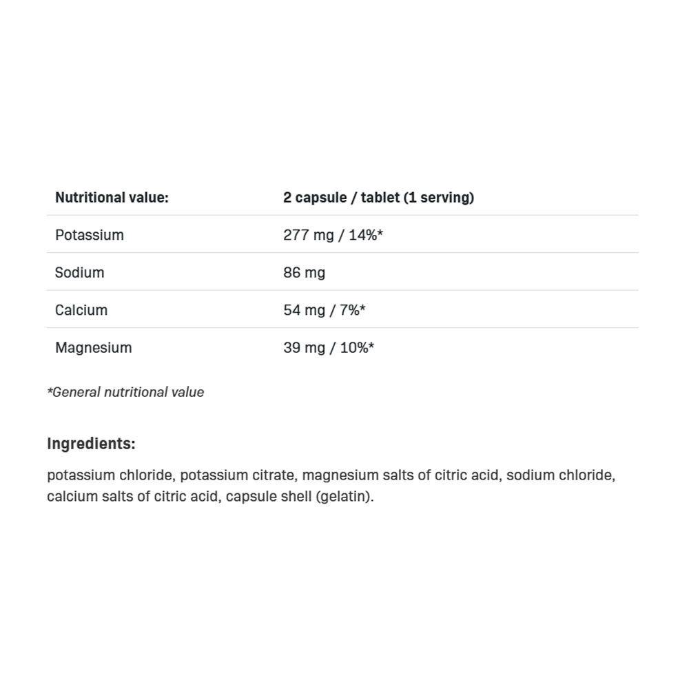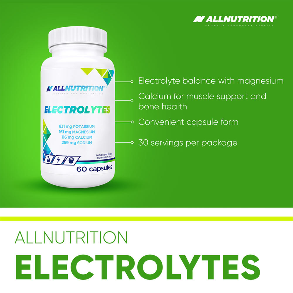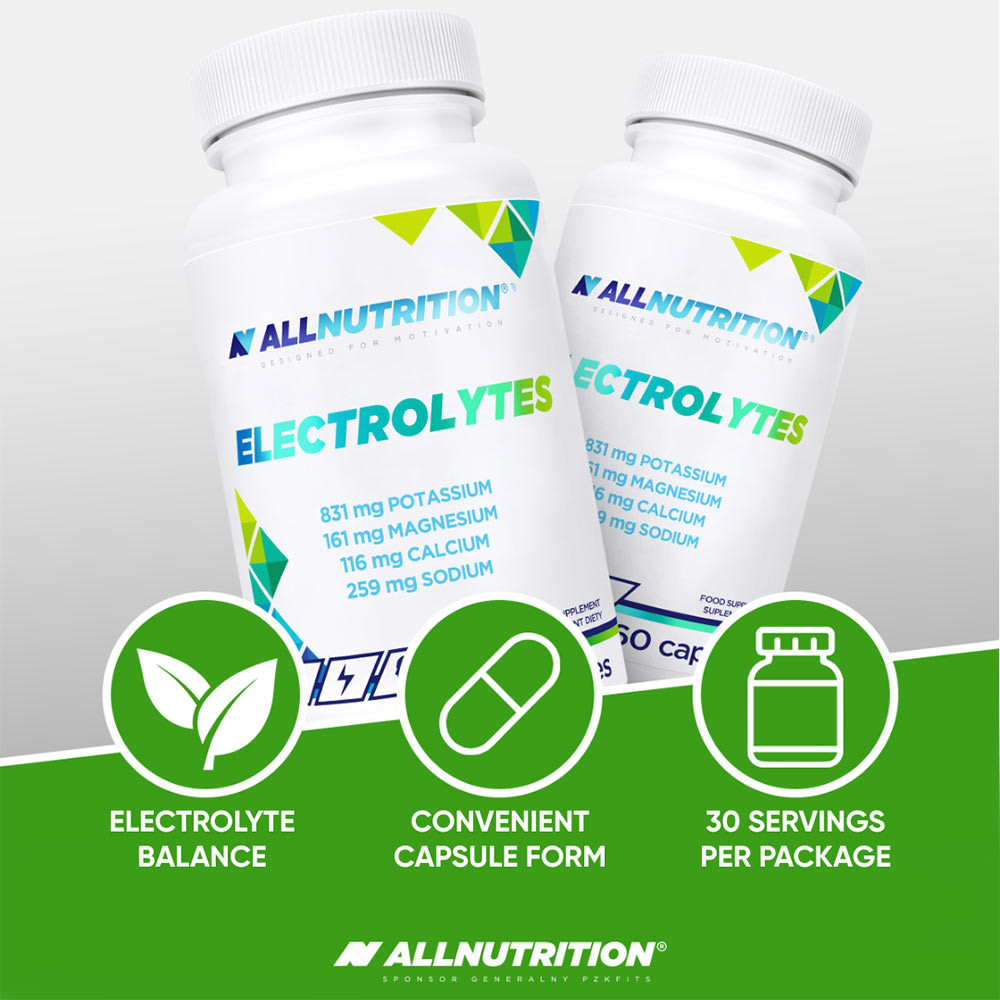 ALLNUTRITION ELECTROLYTES egy elektrolit kényelmes, lenyelhető kapszulákban, amelyet a szervezet gyors és hatékony hidratálására terveztek. Ideális fizikai aktivitás közben, edzés előtt vagy közvetlenül edzés után, amikor a szervezetnek azonnali folyadék- és elektrolitpótlásra van szüksége.