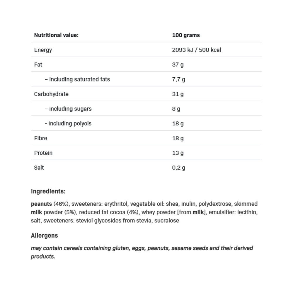 Édesítőszereket tartalmaz. Cukor hozzáadása nélkül. Természetesen előforduló cukrokat tartalmaz. Ha allergiás vagy a termék összetevőire, ne fogyaszd! Túlzott fogyasztása hashajtó hatást okozhat. A kiegyensúlyozott étrend és az egészséges életmód ajánlott. Fogyasztás előtt keverd össze. Tartalmazhat gluténtartalmú gabonaféléket, tojást, földimogyorót, egyéb dióféléket, szezámmagot és ezek származékait.