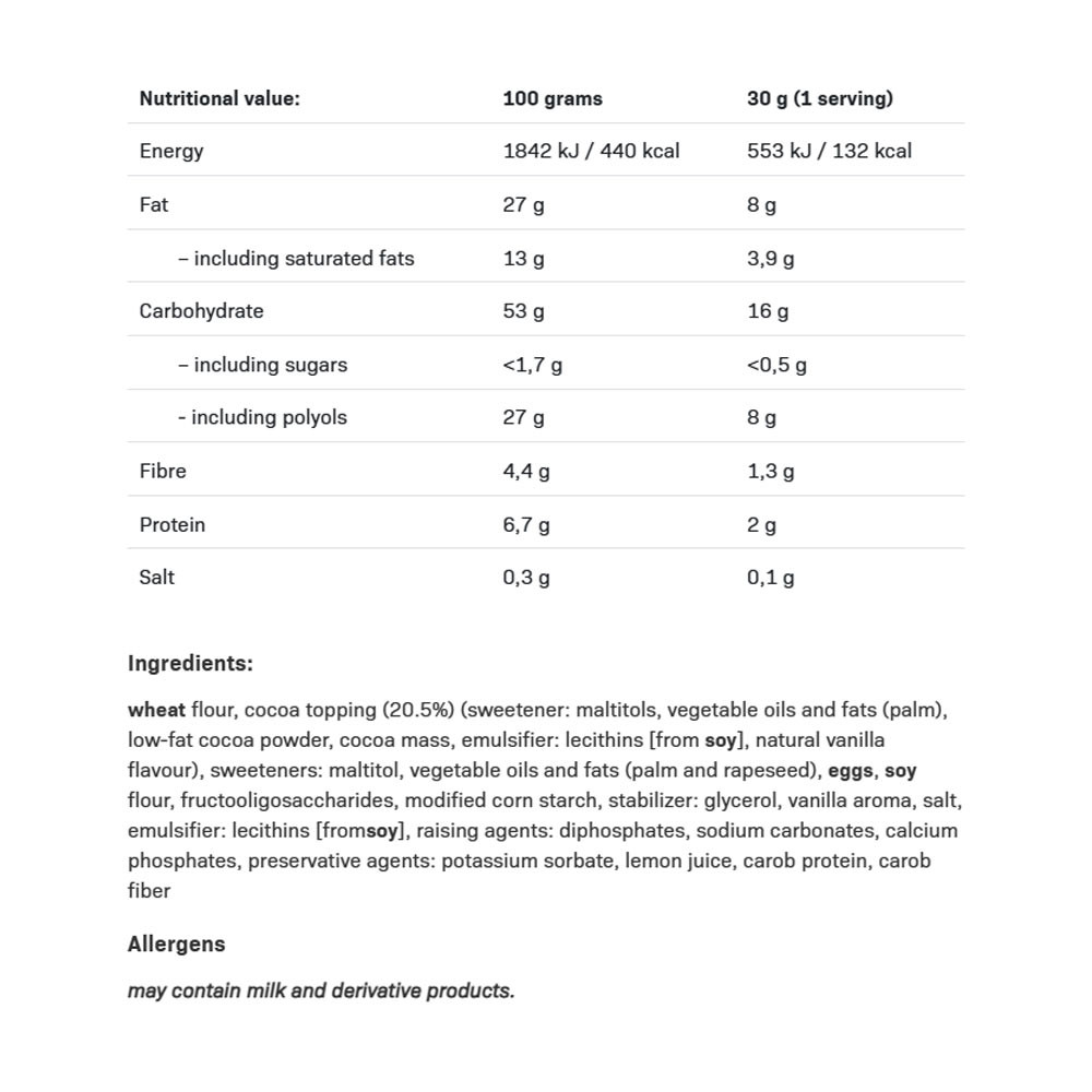 Vanília ízű ostya cukormentes kakaóbevonattal. Édesítőszert tartalmaz. Túlzott fogyasztás hashajtó hatást okozhat. Allergia (túlérzékenység) esetén ne használd. Tejtartalmú termékek és tejszármazékok előfordulhatnak a termékben.