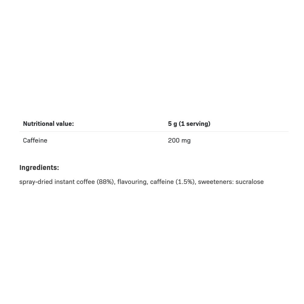 A FITKING ENERGY STRONG COFFEE adagonként 200 mg koffeint tartalmaz 5 g-ban – ez négyszer több, mint a hétköznapi kávéban! Így erős napindító, vagy kiváló választás fizikai és szellemi megterhelés előtt.