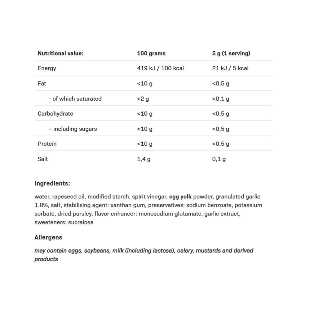 Az ALLNUTRITION SAUCE GARLIC finom, száraz, aromás és alacsony kalóriatartalmú szósz. Cukor- és zsírmentes. A finom ízben kapható SAUCE GARLIC diétás ételeid tökéletes kiegészítője. Bevált recept és a legmagasabb minőségű összetevők garantálják a különleges ízélményt.
