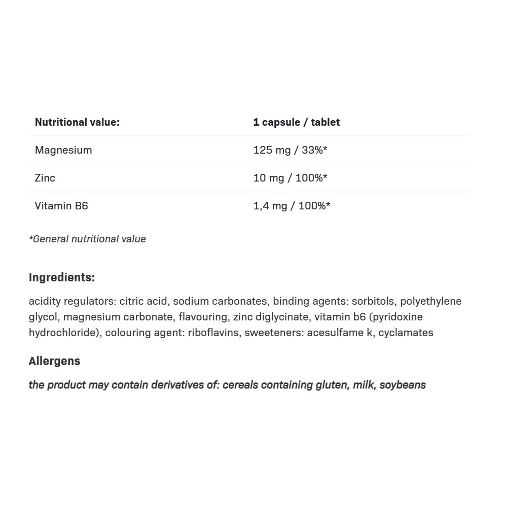 A ZMA+B6 összetevői: savasságot szabályozó anyagok: citromsav, nátriumkarbonát kötőanyagok: szorbitok, polietilénglikol magnéziumkarbonát, aroma, cink-biszglicinát, B6-vitamin (piridoxin-hidroklorid), színezék: riboflavin, édesítőszerek: aceszulfám-K, ciklamátok