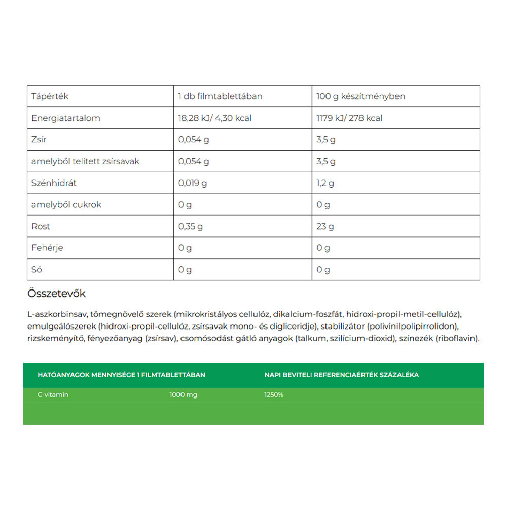 Magas hatóanyag-tartalom: 1000 mg C-vitamin filmtablettánként.