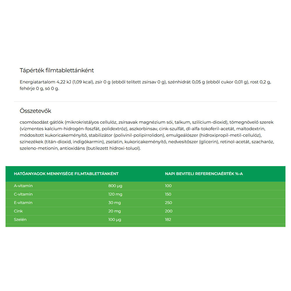A C- és E-vitamin, valamint a cink antioxidáns hatásuk révén hozzájárulnak a sejtek oxidatív stresszel szembeni védelméhez.