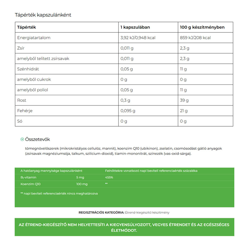 100 mg minőségi Kaneka-koenzim Q10 és 5 mg B₁‑vitamin ami támogatja a szív egészséges működését és az energiatermelést