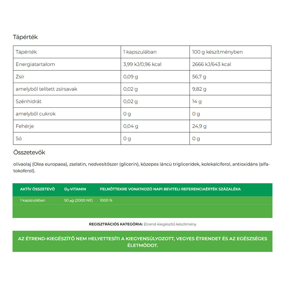2000 NE D₃-vitamin olívaolajban lágyzselatin kapszulában, ami támogatja az immunrendszer, az izom-, csont- és fogazat egészségét