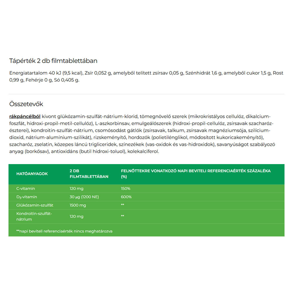 Komplex összetétel: C-vitaminnal, D3-vitaminnal, glükózamin-szulfát, kondroitin-szulfáttal