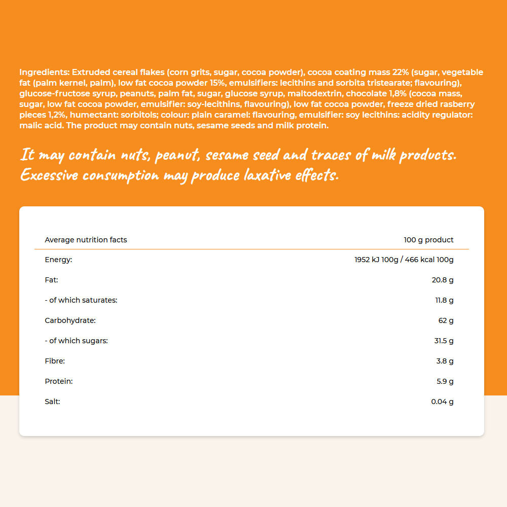 Összetevők: extrudált gabonapehely (kukoricadara, cukor, kakaópor), kakaós bevonómassza 22% [cukor, növényi zsír (pálma mag, pálma), zsírszegény kakaópor 15%, emulgeálószerek: lecitinek és szorbitan-trisztearát aroma], glükóz-fruktózszörp, földimogyoró, növényi zsír (pálma), cukor, glükózszirup, maltodextrin, csokoládé 1,8% (kakaómassza, cukor, zsírszegény kakaópor, emulgeálószer: szójalecitin aroma), zsírszegény kakaópor, fagyasztva szárított málna darabok 1,2%, nedvesítőszer: szorbit színezék: karamell aroma, emulgeálószer: szójalecitin savanyúságot szabályozó anyag: almasav. Dióféléket, szezámmagot és tejfehérjét tartalmazhat!