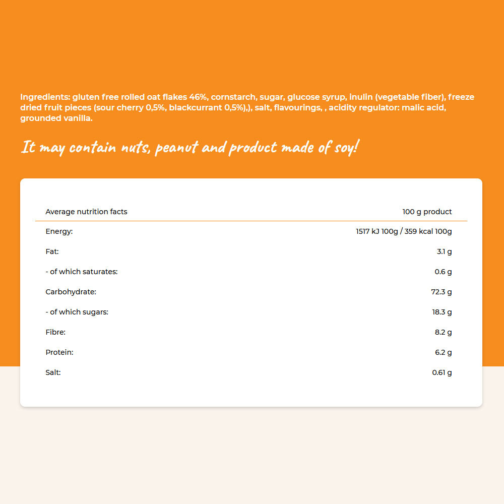 Összetevők: gluténmentes lapított zabpehely 46%, kukoricakeményítő, cukor, glükózszirup, inulin (növényi rost), fagyasztva szárított gyümölcsdarabok (meggy 0,5%, feketeribizli 0,5%), étkezési só, aromák, savanyúságot szabályzó anyag: almasav, vanília őrlemény.