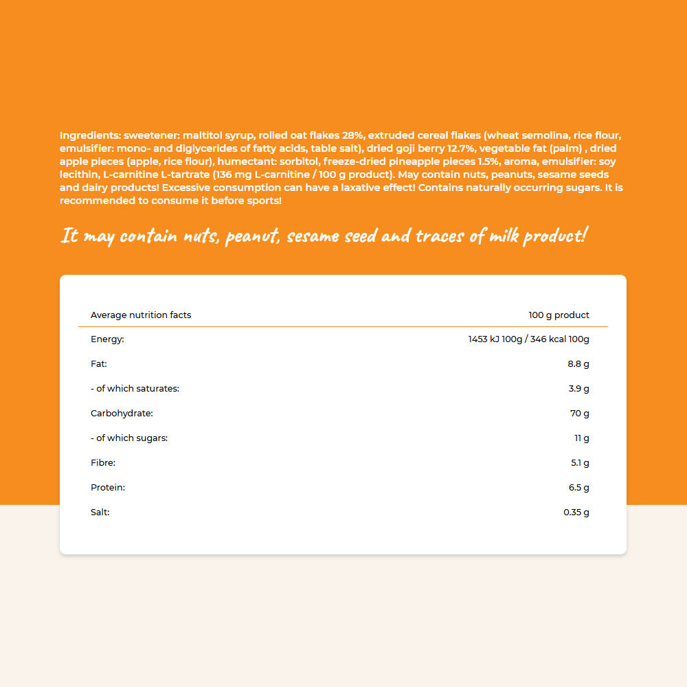 Összetevők: édesítőszer: maltitszirup, lapított zabpehely 28%, extrudált gabonapehely (teljes kiőrlésű búzadara, rizsliszt, emulgeálószer: zsírsavak mono- és digliceridjei, étkezési só), szárított goji bogyó (farkasbogyó) 12,7%, növényi zsír (pálma), aszalt almaapríték (alma, rizsliszt), nedvesítőszer: szorbit, fagyasztva szárított ananász darabka 1,5%, aroma, emulgeálószer: szójalecitin, L-karnitin L-tartarát (136 mg L-karnitin/ 100 g termék). Dióféléket, földimogyorót, szezámmagot és tejből készült terméket tartalmazhat! Túlzott fogyasztása hashajtó hatású lehet! Természetes módon előforduló cukrokat tartalmaz. Fogyasztása sportolás előtt ajánlott!