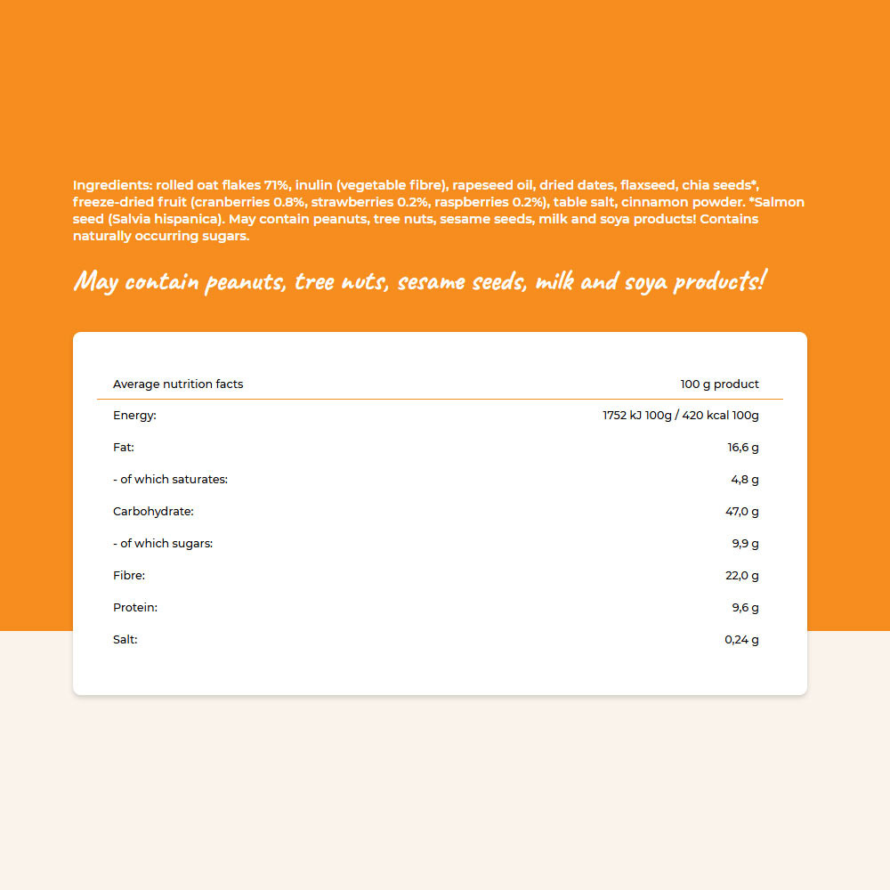 lapított zabpehely 71%, inulin (növényi rost), repceolaj, aszalt datolya, lenmag, chia mag*, fagyasztva szárított gyümölcsök (vörösáfonya 0,8%, eper 0,2%, málna 0,2%), étkezési só, fahéjőrlemény. *Aztékzsályamag (Salvia hispanica). Földimogyorót, dióféléket, szezámmagot, tejből és szójából készült terméket tartalmazhat! Természetes módon előforduló cukrokat tartalmaz.