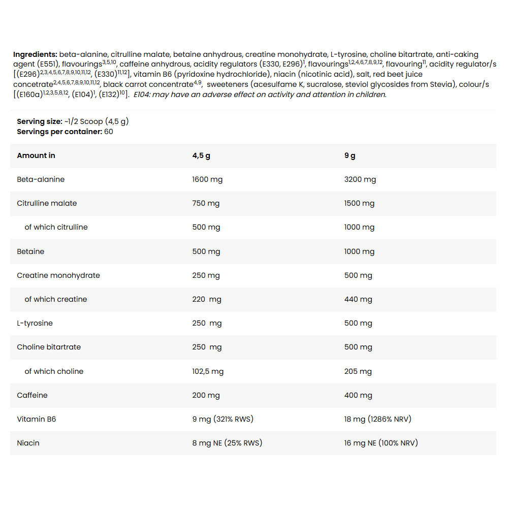 Koffeint tartalmaz (200 mg / adag – 4,5 g 400 mg / napi adag – 9 g). Fogyasztása gyermekek és várandós nők számára nem ajánlott. A termék olyan összetevőket tartalmaz, mint a béta-alanin és a citrullin-malát, fizikailag aktív felnőttek számára készült, különösen azoknak, akik magas intenzitású és nagy volumenű erőedzéseket végeznek. A B6-vitamin és a niacin hozzájárul a fáradtság és kifáradás csökkentéséhez.