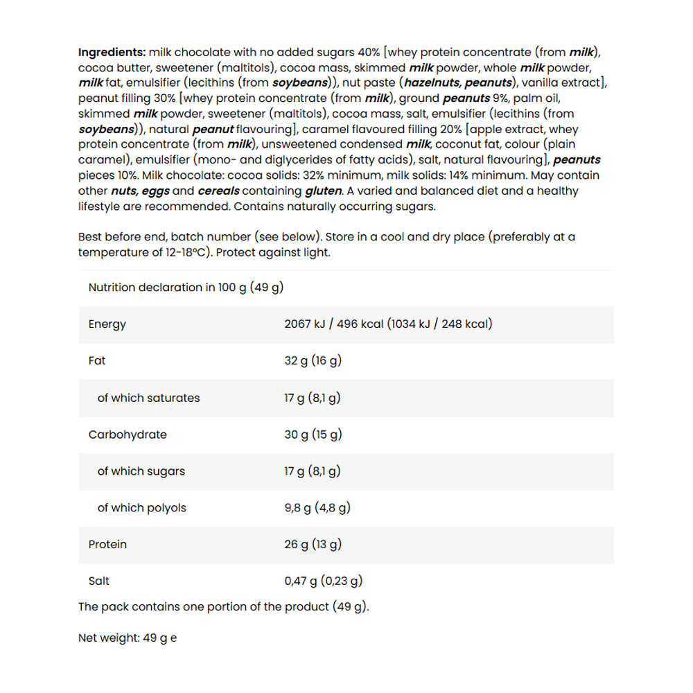 Összetevők: tejcsokoládé hozzáadott cukor nélkül 40% [tejsavófehérje-koncentrátum (tejből), kakaóvaj, édesítőszer (maltitok), kakaómassza, sovány tejpor, teljes tejpor, tejzsír, emulgeálószer (lecitinek (szójából)), diópaszta (mogyoró, földimogyoró), vaníliakivonat], mogyorós töltelék 30% [tejsavófehérje-koncentrátum (tejből), darált földimogyoró 9%, pálmaolaj, sovány tejpor, édesítőszer (maltitok), kakaómassza, só, emulgeálószer (lecitinek (szójából)), természetes földimogyoró aroma], karamell ízű töltelék 20% [alma kivonat, tejsavófehérje-koncentrátum (tejből), cukrozatlan sűrített tej, kókuszzsír, színezék (egyszerű karamell), emulgeálószer (zsírsavak mono- és digliceridjei), só, természetes aroma], földimogyoró darabok 10%. A tejcsokoládé legalább 32% kakaó szárazanyagot és legalább 14% tej szárazanyagot tartalmaz. Tartalmazhat más dióféléket, tojást és glutént tartalmazó gabonaféléket. A változatos és kiegyensúlyozott étrend, valamint az egészséges életmód javasolt. Természetesen előforduló cukrokat tartalmaz. HASZNÁLAT (1 adag = 49 g)
