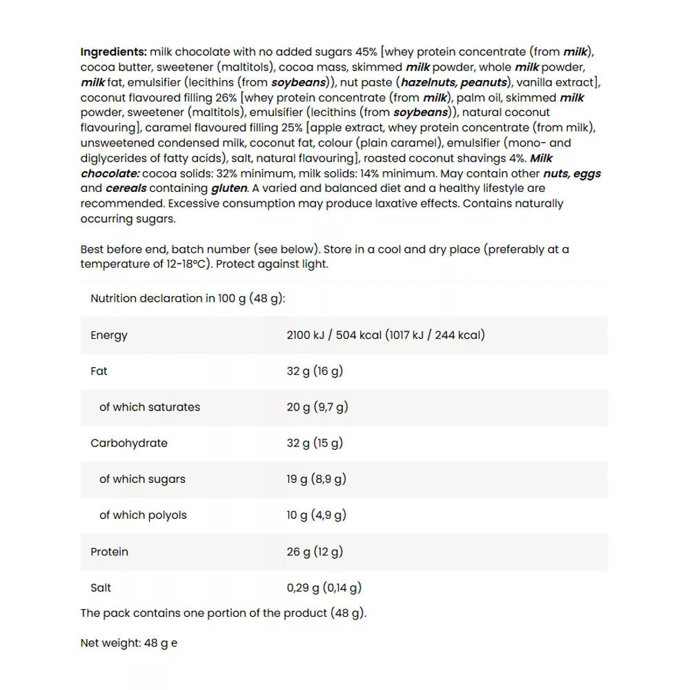 Tejcsokoládéba mártott fehérjeszelet hozzáadott cukor nélkül, kókuszos és karamellízű töltelékkel, kókuszreszelékkel. Édesítőszerrel.