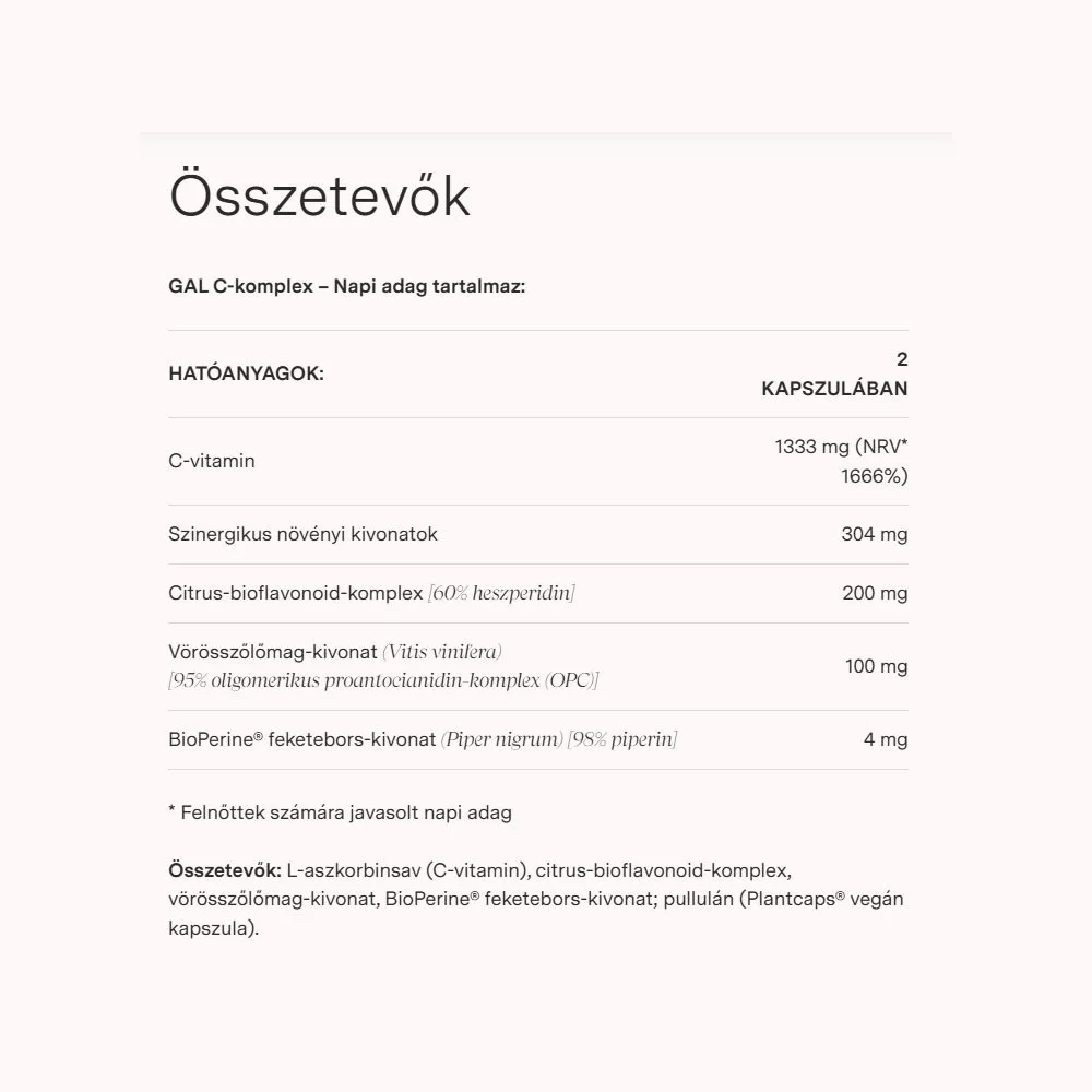 E termék a C-vitamint a természetben is megtalálható formájában tartalmazza, szinergikus hatású növényi kivonatok mátrixában. A feketebors egy szabadalmaztatott kivonata, a BioPerine® a felszívódást segíti. A citrusbioflavonoid-komplex és a vörös szőlő héjának és magjának kivonatai pedig olyan természetes hatóanyagokat tartalmaznak, amelyek a természetben is gyakran fordulnak elő C-vitaminban dús élelmiszerekben, nem véletlenül.