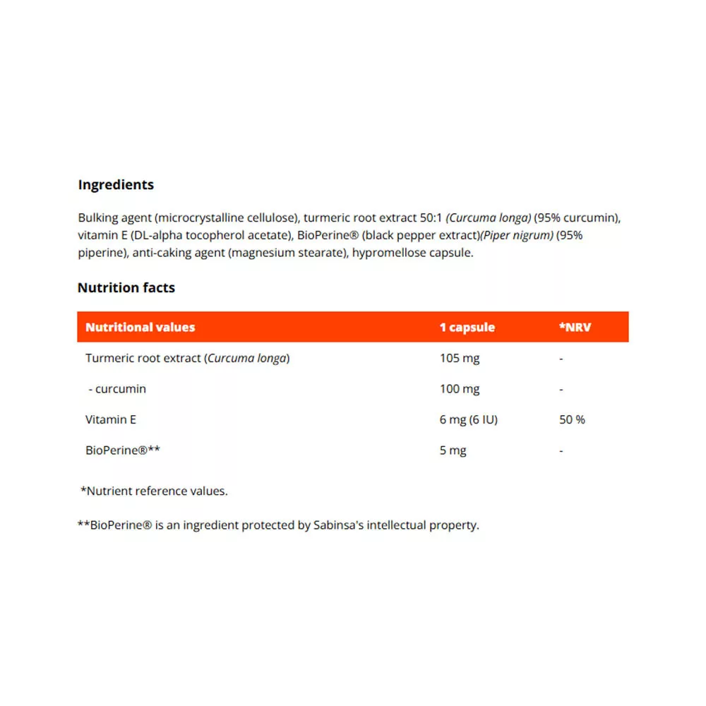A kurkumin + E-vitamin egy funkcionális étrend-kiegészítő, amely két egyedülálló összetevő előnyeit egyesíti. A főszerepet az esszenciális E-vitamin játssza, amely hozzájárul a sejtek oxidatív stresszel szembeni védelméhez. Nem marad le azonban a kurkuma gyökér kivonat sem, amely az indiai kultúra népszerű és hagyományosan használt része. A kivonat 50:1 kivonási aránnyal büszkélkedhet, ami azt jelenti, hogy 105 mg kivonat előállításához akár 5250 mg kurkuma gyökeret is felhasználnak. A kivonatot 95% kurkuminra standardizálták. Így magas koncentrációjával és minőségével tűnik ki. A kurkumin + E-vitamin nagyszerűen illeszkedik majd az étrend-kiegészítő rutinodba, és tökéletesen beleillik az egészséges életmódba.