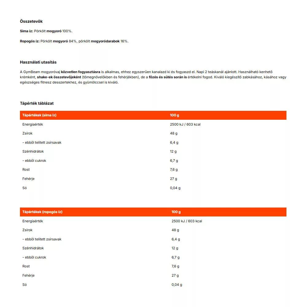 A GymBeam mogyoróvaj közvetlen fogyasztásra is alkalmas, ehhez egyszerűen kanalazd ki és fogyaszd el. Napi 2 teáskanál ajánlott. Használható kenhető krémként, shake-ek összetevőjeként (tömegnövelőkben és fehérjékben), de a főzés és sütés során is értékelni fogod. Kiváló kiegészítő zabkásához, kásához vagy egészséges fitnesz desszertekhez és gyümölccsel is kiváló.