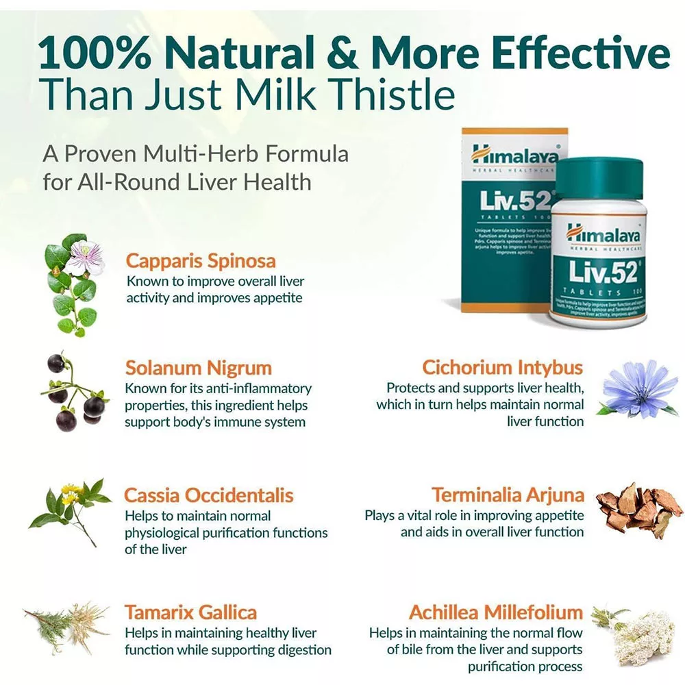 A Himalaya Liv.52 (LiverCare) használata segíthet az enzimek szintjének szabályozásában, az asszimiláció optimalizálásában és a máj funkcionális hatékonyságának javításában. A Liv.52 (LiverCare) segít a máj funkcionális hatékonyságának helyreállításában a hepatic parenchyma védelmével és elősegíti a májsejtek regenerálódását. Megkönnyíti az acetaldehid, az alkohol-anyagcsere toxikus metabolitjának gyors eltávolítását, és segít az alkohol okozta májkárosodás elleni védelemben. A Liv.52 (LiverCare) segít csökkenteni a lipotrop aktivitást krónikus alkoholizmus esetén, és megakadályozza a máj zsíros beszivárgását. Cirrhotikus állapotokban a Liv.52 (LiverCare) segít megállítani a betegség előrehaladását és megakadályozza a további májkárosodást. A Liv.52 napi kiegészítőként javítja az étvágyat, az emésztési és asszimilációs folyamatokat, és elősegíti a súlygyarapodást.