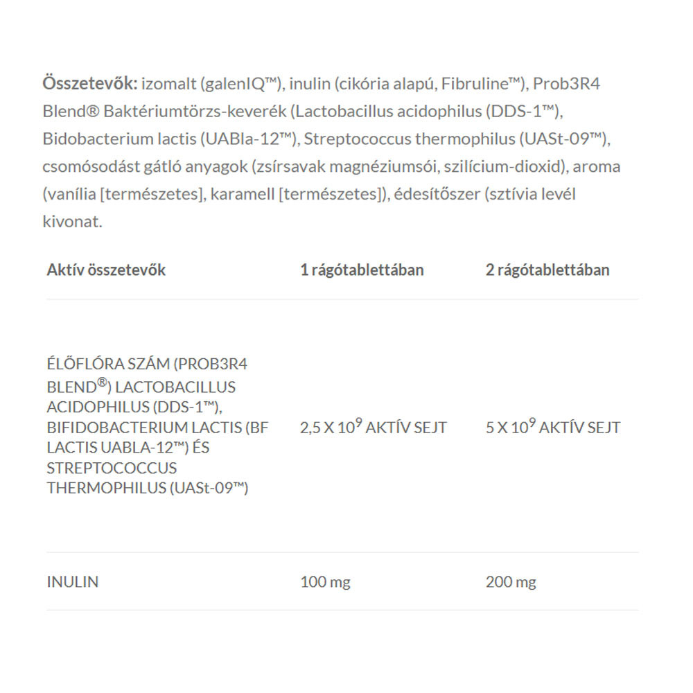 JutaVit Probium Kid Gyermekeknek + Inulin Lactobacillus acidophilus-t (DDS-1™), Bi­dobacterium lactis-t (Bf lactis UABla-12™), Streptococcus thermophilus-t (UASt-09™) és Inulint tartalmazó étrend-kiegészítő készítmény kellemes, természetes vanília és karamell aromával és édesítőszerrel.