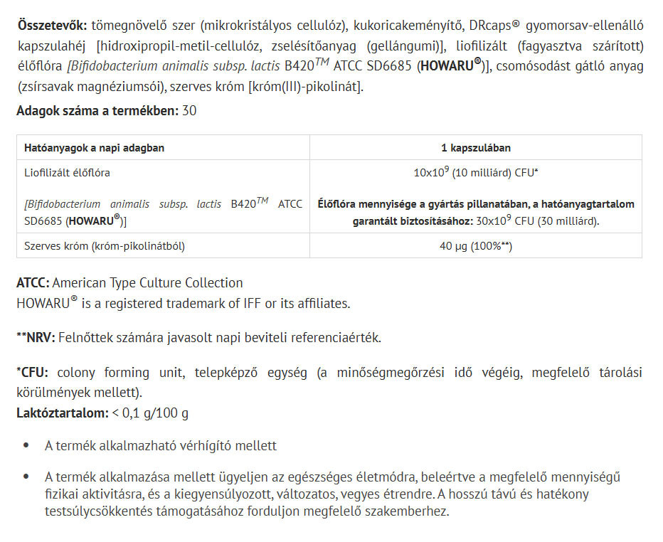HOWARU® liofilizált élőflórát, valamint szerves krómot tartalmazó étrend-kiegészítő, gyomorsav-ellenálló kapszulában.