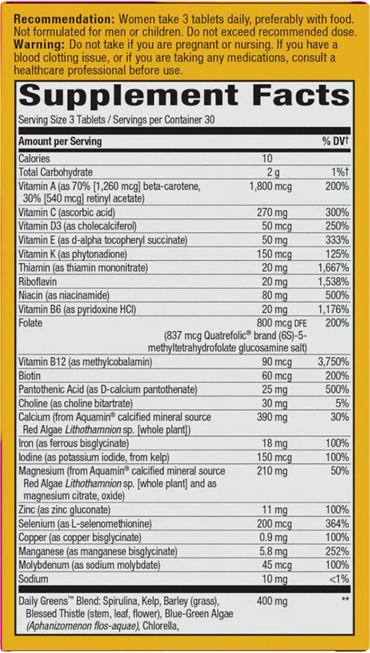 Alive! Max3 Daily az általunk kínált leghatásosabb női multivitamin, amely a legnagyobb mennyiségű B-vitamin komplexet tartalmazza, hogy a táplálékot sejtenergiává alakítsa. Speciális élelmiszer-alapú porkeverékekkel készül, beleértve a CranRx®-t, a Daily Greens™-t és az emésztőenzimet. A Max3 kiegyensúlyozottan támogatja a női csontok, bőr, szem, immunrendszer és szív egészségét, valamint az energia-anyagcserét.HASZNÁLAT (1 adag = 3 tabletta )