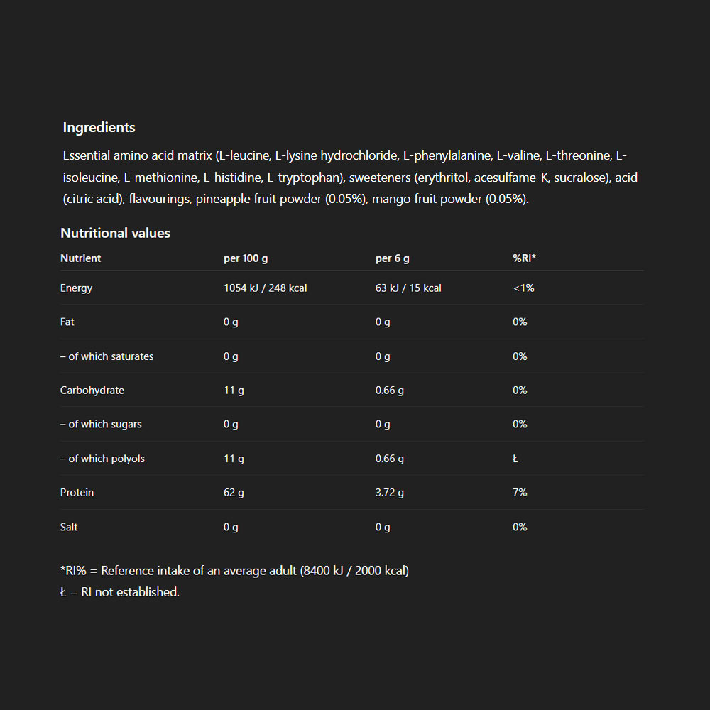 Ízesített, instant aminosav formula, 1733 mg BCAA, összesen 4314 mg esszenciális aminosav-tartalommal, adagonként új, izgalmas ízvilággal!