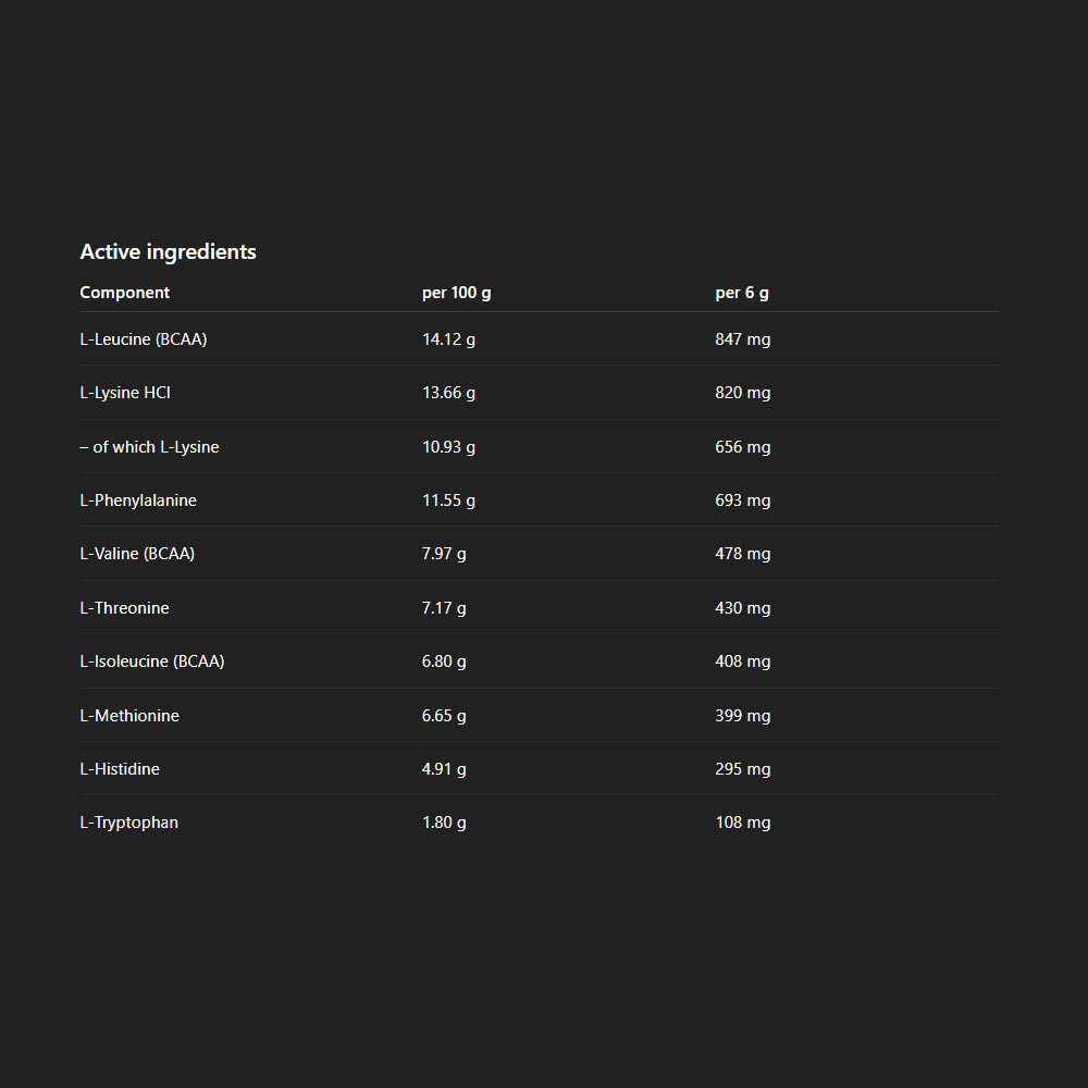 Keverj össze egy adag (6 g) EAA port 250 ml hideg vízzel és fogyaszd edzés előtt, közben vagy edzés után. Alternatív megoldásként fogyaszthatod étkezések között is. A csomagban található adagolókanál csak a kimérés segítésére szolgál, a pontos adagoláshoz minden esetben használj digitális gramm mérleget!