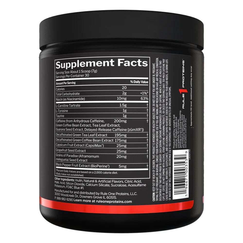 Gyermekek elől elzárva tartandó. Ez a termék csak egészséges felnőtteknek készült. Ne használd, ha 18 év alatti vagy, terhes vagy, teherbe esni próbálsz, vagy szoptatsz. Használat előtt konzultálj orvosoddal, ha bármilyen gyógyszert szedsz vagy bármilyen egészségügyi problémád van. Műtét előtt két héttel hagyd abba a használatát. Minden adag körülbelül 200 mg koffeint tartalmaz, ami körülbelül annyi, mint két csésze kávé, ne kombináld alkohollal, más koffeintartalmú termékekkel, és ne lépd túl a napi két adagot. A túl sok koffein idegességet, ingerlékenységet, álmatlanságot és esetenként szapora szívverést okozhat. Az edzés növelheti a folyadékszükségletet, ezért igyál sok vizet, hogy jól hidratált maradj. Hagyd abba a szedést, ha bármilyen mellékhatást vagy szokatlan tünetet tapasztalsz.