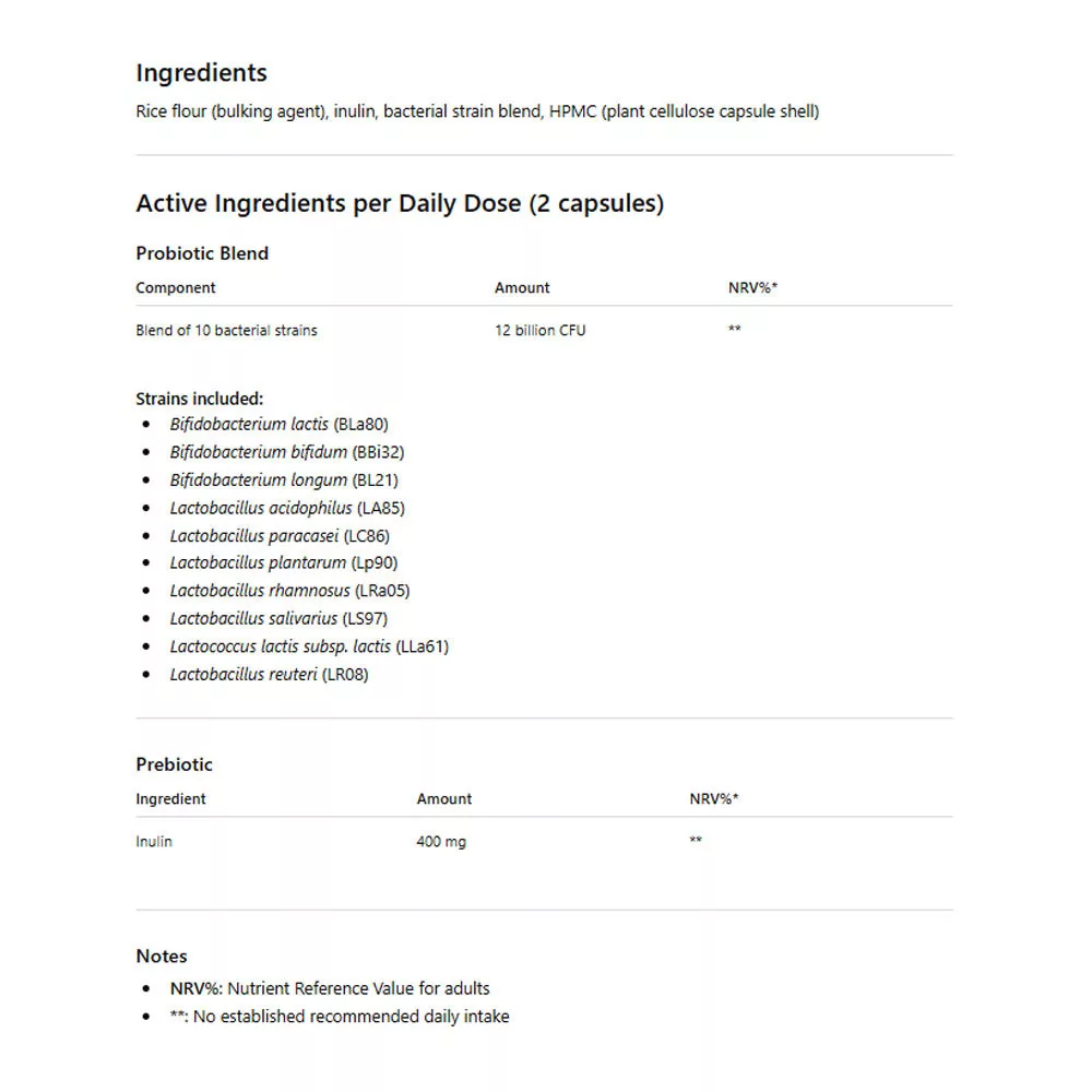 - Szinergia az inulinnal: a hozzáadott prebiotikum célzott szubsztrátot biztosít, támogatva a megtelepedést és az aktivitást.