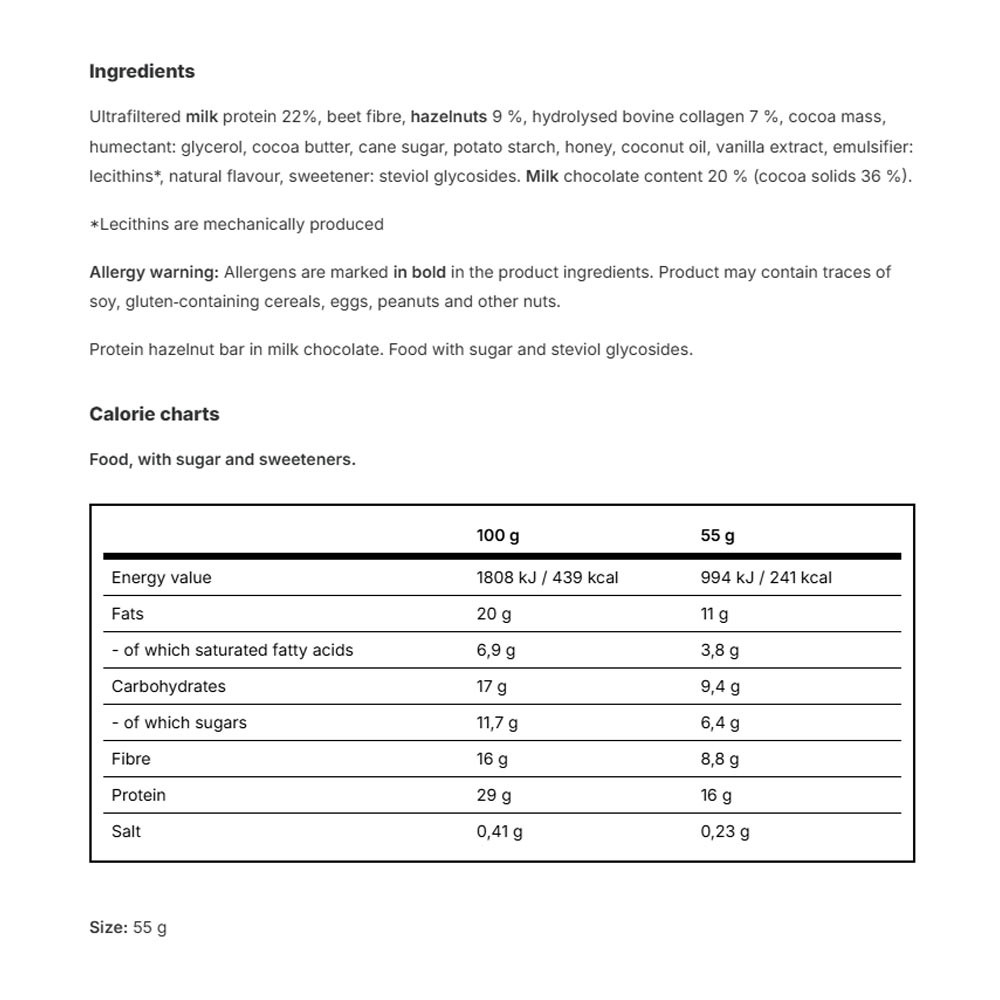 A szelet belsejében egy szuperlágy mézes‑tejes alapot találsz, amely tökéletesen elolvad a nyelveden. A fehérjeropogóssal és a csokoládéval bevont mogyoróval együtt abszolút mesés kombinációt alkotnak, amely levesz a lábadról.