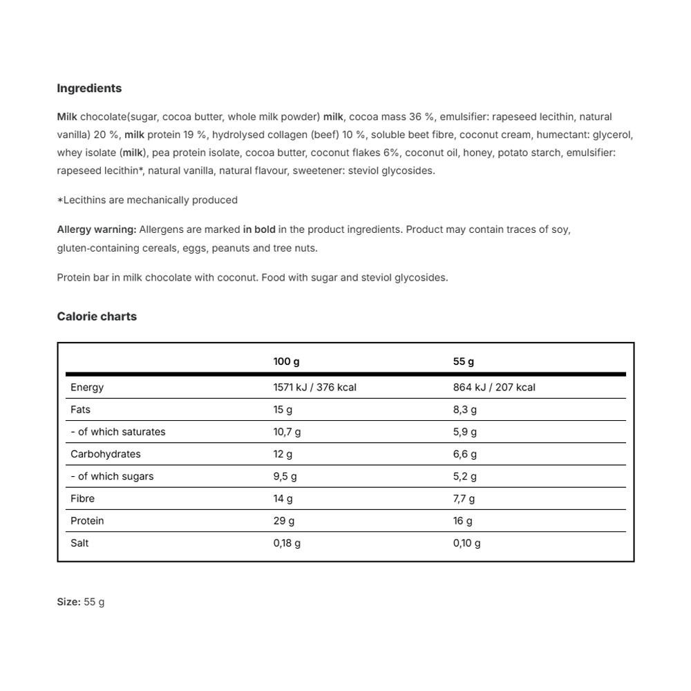 Az ízlelőbimbóid maximális kényeztetéséért reszelt kókuszdarabokat kombináltunk luxus kókuszvajjal és egy tisztességes adag teljes értékű fehérjével. Bónuszként az egész szeletet prémium tejcsokoládéval vontuk be.