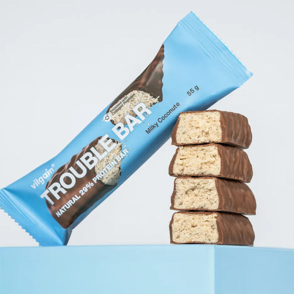 Ne hagyd, hogy a Trouble Bar hihetetlenül gazdag íze megtévesszen! Ez továbbra is egy fehérjeszelet, magas, 29%-os fehérjetartalommal. Legfőbb részét a tejfehérje teszi ki, amely az egyik legjobb felszívódási aránnyal rendelkező fehérje. A mátrix összetevői emellett a tejsavó- és borsófehérje.