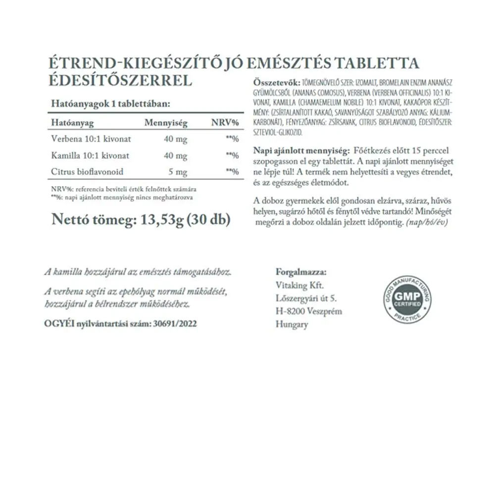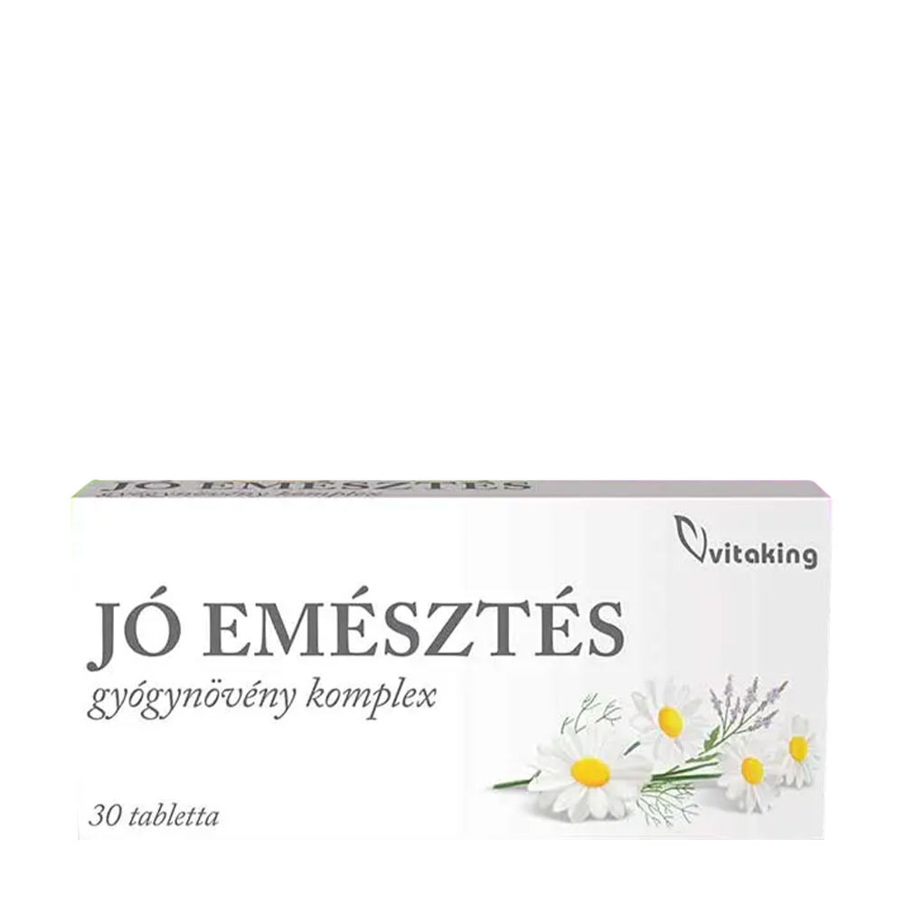 A Vitaking Jó emésztés gyógynövény komplex tabletta egy különleges, komplex készítmény. Verbena kivonatot, kamilla kivonatot, citrus bioflavonoidokat, és bromelain enzimet (ananász gyümölcsből) tartalmaz.