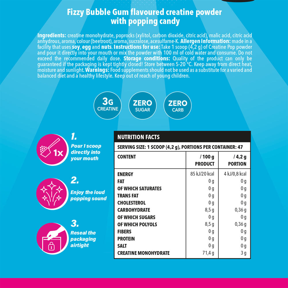 Minden adag tiszta kreatin-monohidrátot tartalmaz valódi pattogócukorral, így a napi kreatinadagod valódi robbanássá válik.