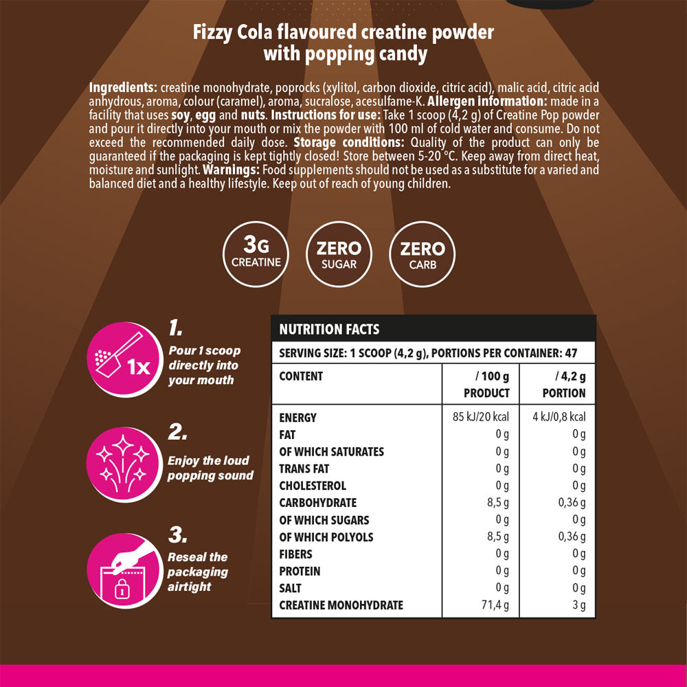 Minden adag tiszta kreatin-monohidrátot tartalmaz valódi pattogócukorral, így a napi kreatinadagod valódi robbanássá válik.