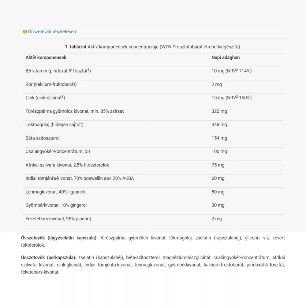 A WTN Prosztatabarát zsírsavakkal, mikrotápanyagokkal, a népi hagyományokból és a modern kutatásokból ismert növényi kivonatokkal illeszkedik a férfiszervezet igényeihez.