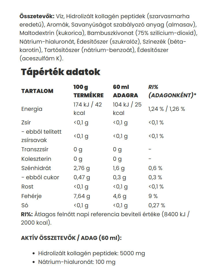 Az étrend-kiegészítők nem helyettesítik a változatos étrendet. Gyermekektől elzárva tartandó. Ne lépd túl az ajánlott napi adagot (napi 3 shot). Nyomokban tojást, szóját, zabot és tejet tartalmazhat.